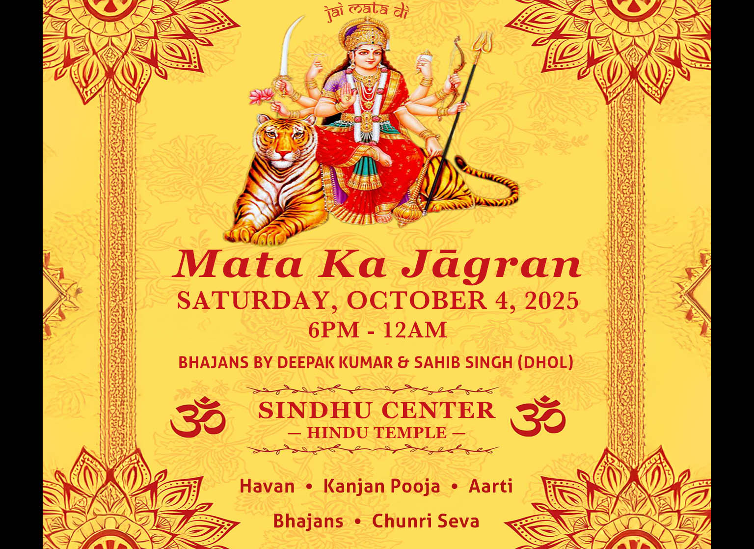 Mata Ka JagranonSaturday, October 4, 2025atSindhu Center— 6:00 — 6:30pm: Havan6:30 — 6:45pm: Kanjan Pooja6:45pm: Aarti 7:00 — 8:00pm: Priti Bhojan8:00 […]